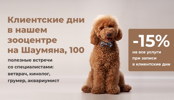 А еще мы подарим скидку -15% на любую услугу зооцентра на улице Шаумяна 100, если сразу после лекции вы запишете хвостика и внесете оплату.